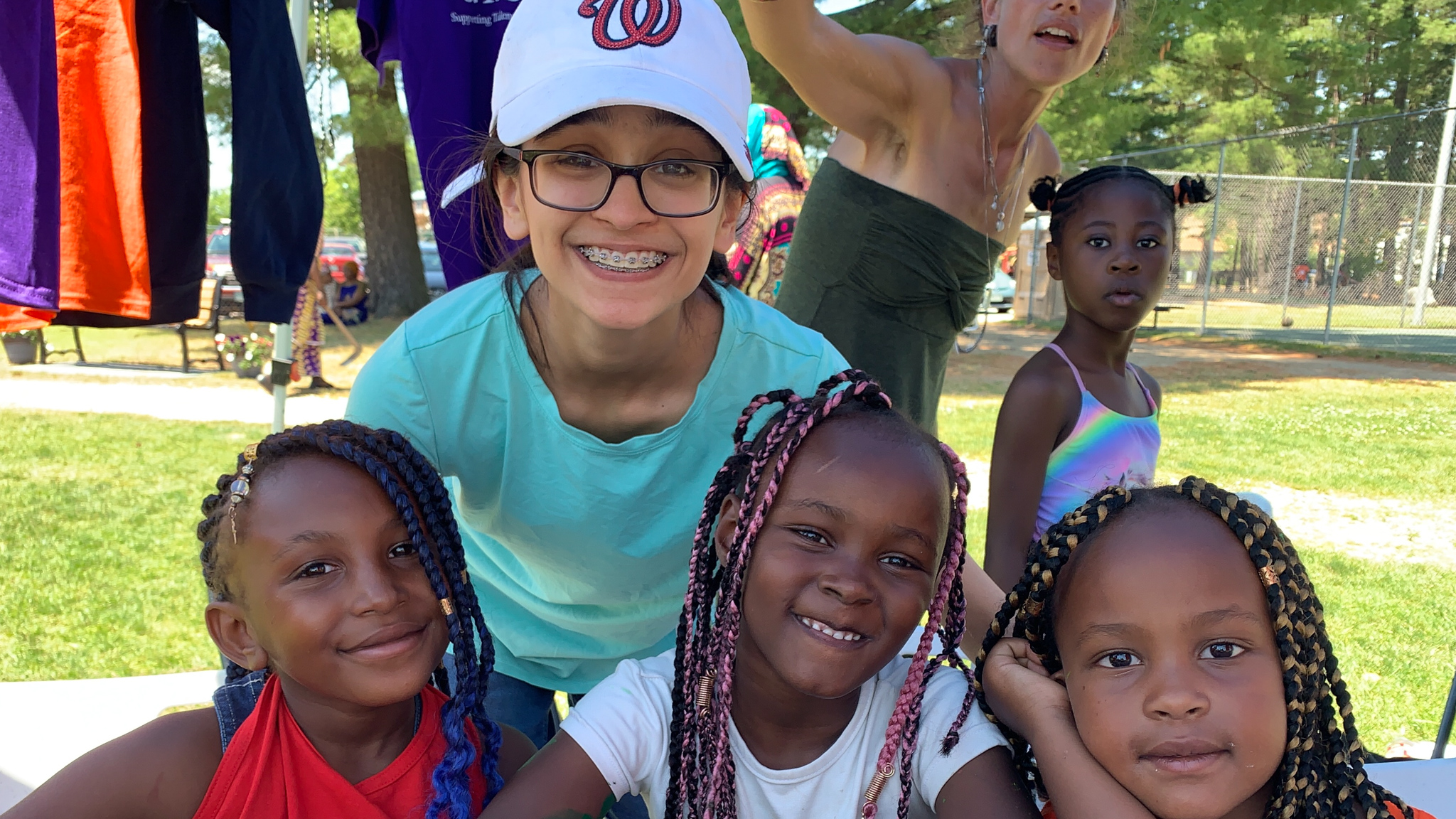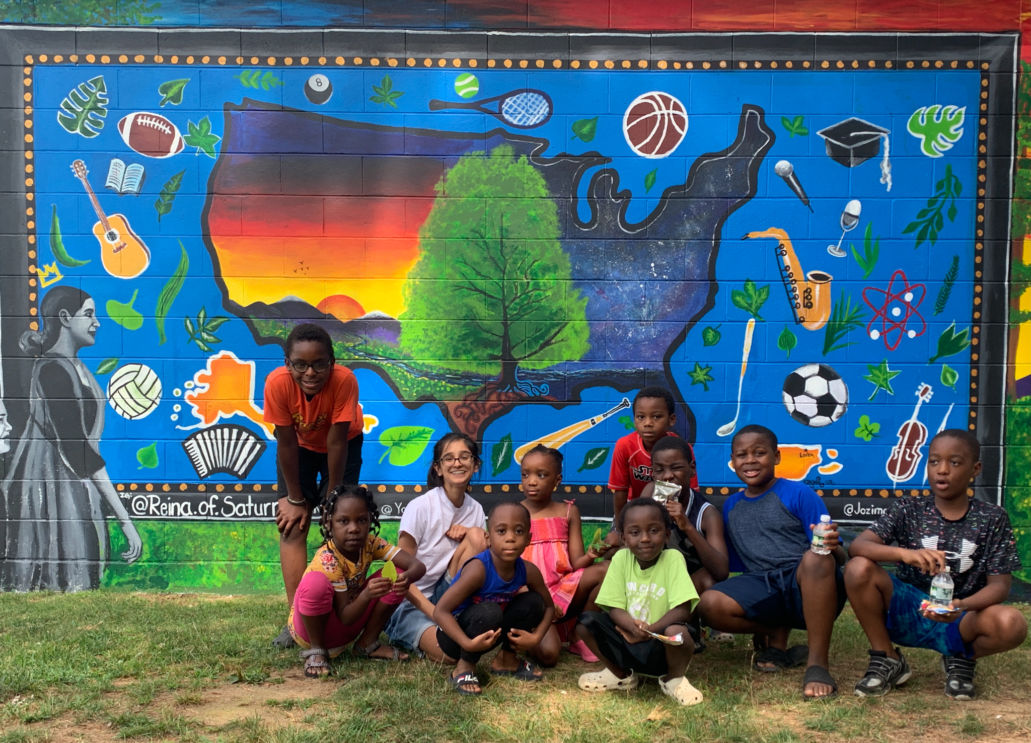 Riyah Patel and Scholars enjoying a quick break by the mural before tackling the afternoon math lesson.