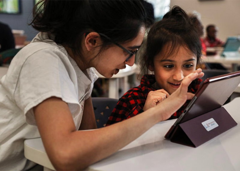 Riyah’s parents are a big source of support in this endeavor. Both attended a tutoring session in April. Her dad, Jay Patel, doled out iPads, while her 10-year-old sister, Kiki, helped out with tutoring, as did Manisha. But these students can’t typically turn to their own parents for that help. As new arrivals to the country themselves, their parents aren’t in a position to assist with homework — either because they’re working long hours or because they don’t have the language skills or cultural familiarity with the US school system.