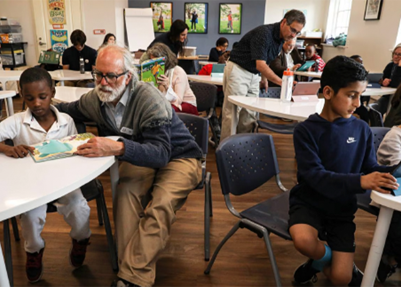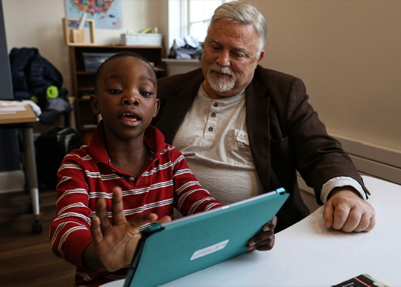 Volunteer Mike Koutelis of Nottingham, N.H., tutors 6-year-old Joel Shariire. Koutelis is one of 26 tutors who have worked with the nonprofit New American Scholars.CHERYL SENTER FOR THE BOSTON GLOBE